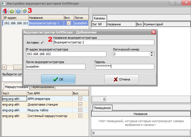 В появившемся окне необходимо добавить (1) новый видеорегистратор, указав параметры подключения к видеорегистратору: Назавание, IP-адрес, Логин-пароль, Логический № в структуре комплекса Инсонет. По окончании нажать кнопку "ОК". После этого, нажав кнопку (3) получаем структуру данных с видеорегистратора.